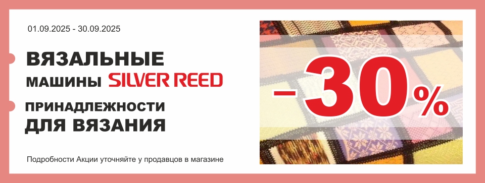 Наша Акция – для вас! Только до 30 сентября 2025 вы можете купить вязальную машину и аксессуары Silver Reed со скидкой 30%!